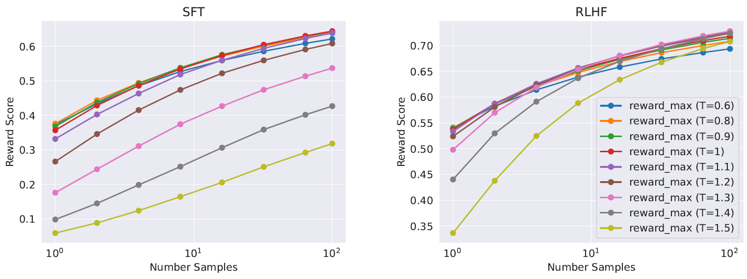 图 8:对输出抽样并用奖励模型对它们打分时,RLHF 对温度的影响。