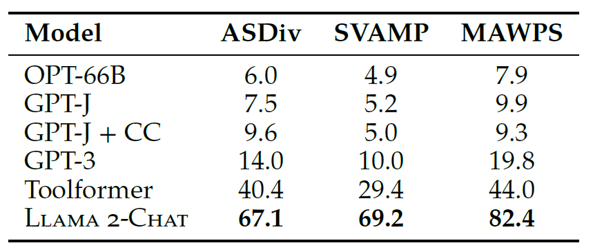 此外,我们的研究还扩展到了 LLaMA2-Chat 能使用计算器之后的性能。结果见表 15,