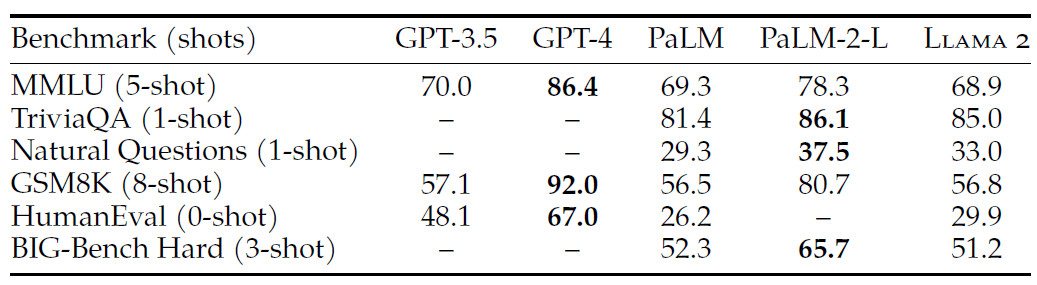 • 大多数基准测试中,LLaMA2 性能更好;