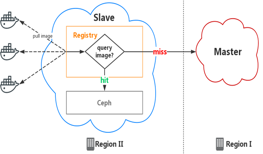 The customized part provides support for transparently redirecting requests to remote hubs/registrys (request origin) when local pull misses.