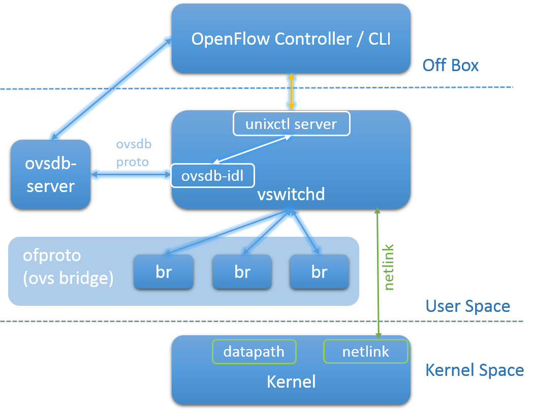 As depicted in Fig.1, ovs-vswitchd sits in the key position of OVS, which needs to interact with OpenFlow controller, OVSDB, and kernel module.