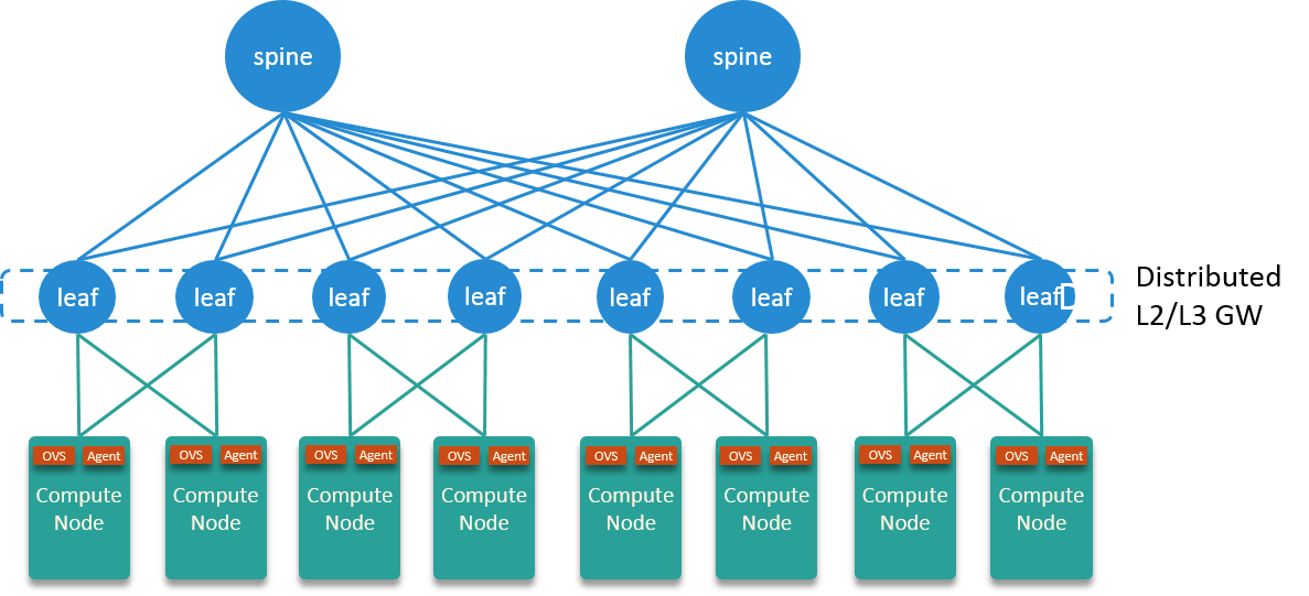The data center network utilizes a Spine-Leaf architecture, with Leaf nodes serve as both distributed L2 and L3 gateway.