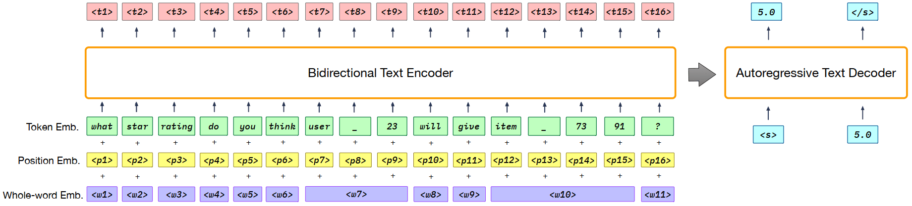 将多个推荐任务放到同一个 text-to-text encoder-decoder 中,并使用相同的 language modeling loss 进行训练, 而不是设计 task-specific 架构和 objective functions。