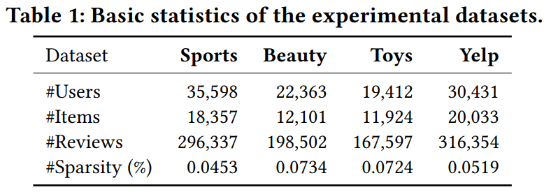 We conduct extensive experiments over four real-world datasets. The Amazon1 datasets are collected from Amazon.com platform with user ratings and reviews on 29 categories of products. In this paper, we adopt three of them to evaluate our method, namely Sports & Outdoors, Beauty, as well as Toys & Games. Besides, Yelp2 dataset contains a large number of user ratings and reviews for business recommendation. We follow [80] and use transaction records between January 1, 2019 to December 31, 2019. Due to space limit and that the results on Yelp show similar trends with other datasets, we put the experimental results on Yelp dataset in the Appendix. The detailed statistics of these datasets are presented in Table 1.