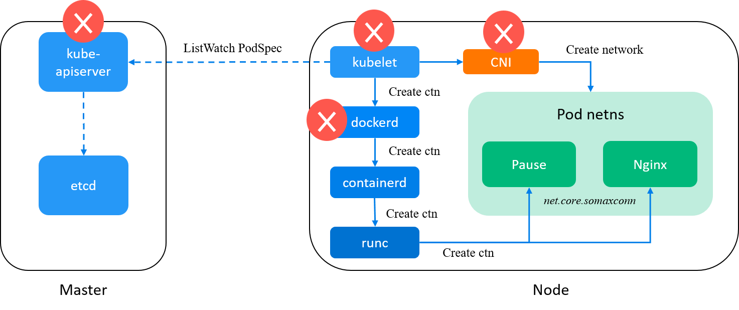 kubelet: watchkube-apiserver, on receiving a new Pod spec, calldockerdto create containers for the Pod (and later call CNI plugins to init pod network); -