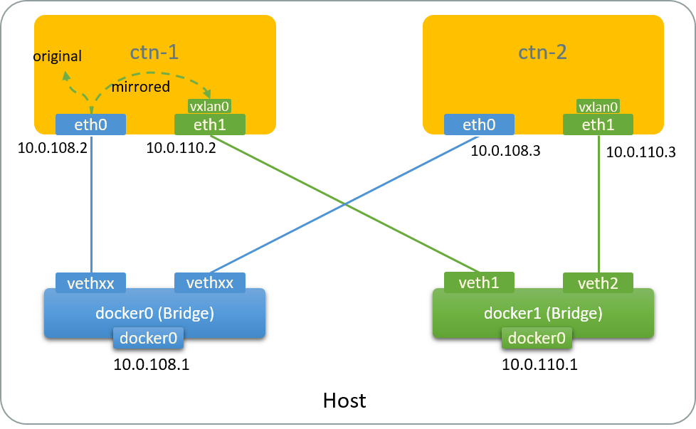 $ nsenter -t $NETNS1 -n tc filter add dev eth0 parent ffff: protocol all u32 match u32 0 0 action mirred egress mirror dev vxlan0