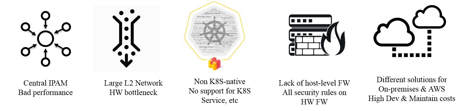 3. Current networking solution is non-K8S-native, so it doesn’t support features such as Kubernetes Service (ClusterIP), thus many applications (e.g. Spinnaker, Istio) can not be deployed or migrated to container platform.