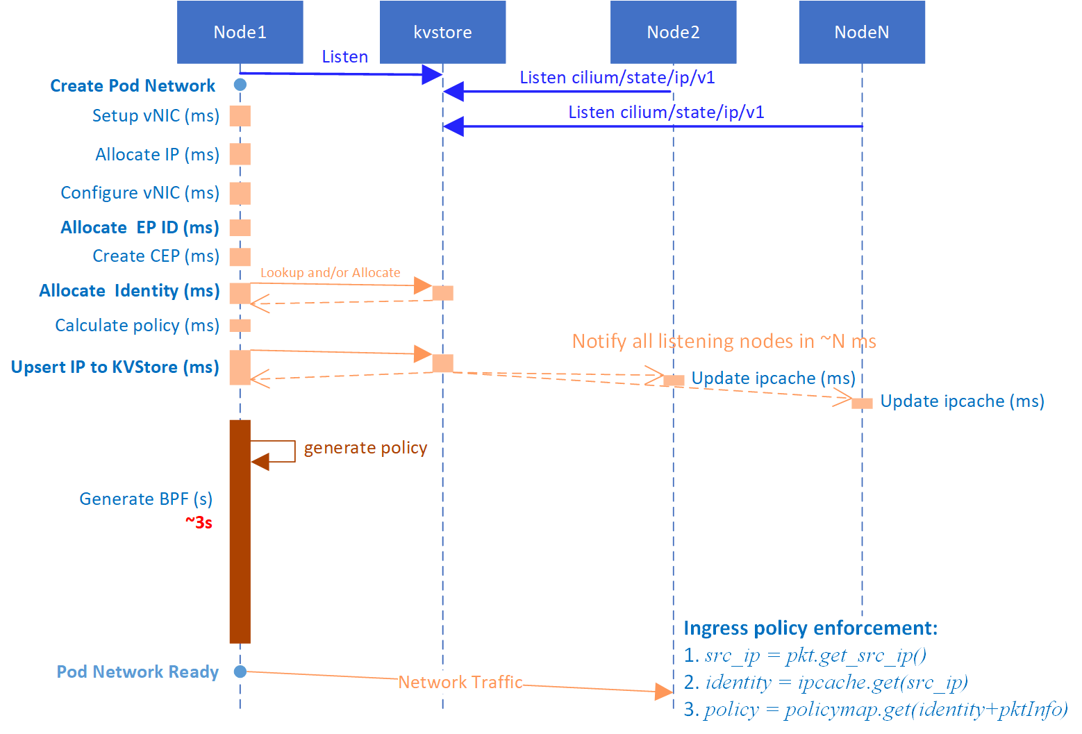 When a pod is created, a new identity might be allocated. On receiving an identity create event, all cilium-agents would regenerate BPF for all the pods on the node to respect the identity, which is a fairly heavy operation, as compiling and reloading BPF for just a single pod would take several seconds.