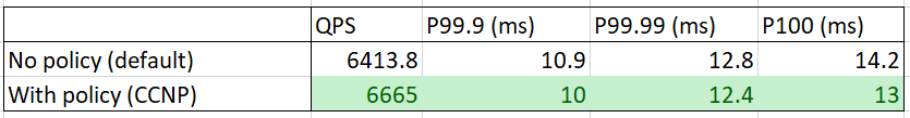 Perhaps the most surprising piece with Cilium-powered network policies is: enabling CNP will not slow down the dataplane - on the opposite, it will increase the performance a little bit! Below is one of our benchmarks:
