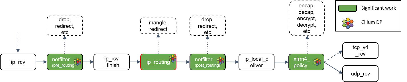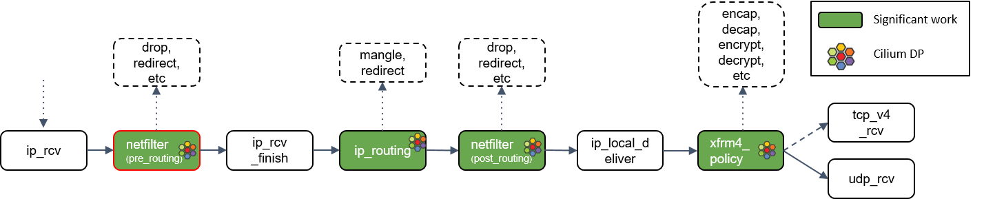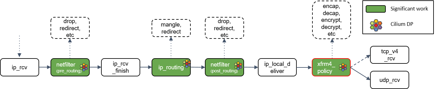 | Node | Node | ip-xfrm (for encryption), ip tables for initial decapsulation routing (if vxlan), veth-pair, ipvlan |