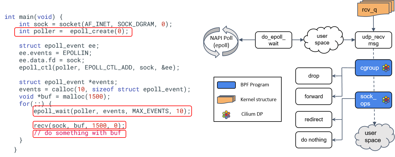 下图左边是一段 socket listening 程序,这里省略了错误检查,而且 epoll 本质上也