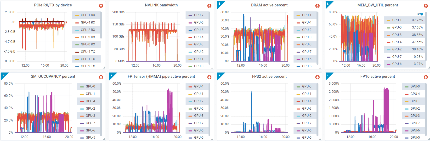 Furthermore, paying closer attention to saturation metrics can be beneficial. These metrics include FP64/FP32/FP16 activation, tensor core activation percentage, NVLINK bandwidth, GPU memory bandwidth percentage, and more.