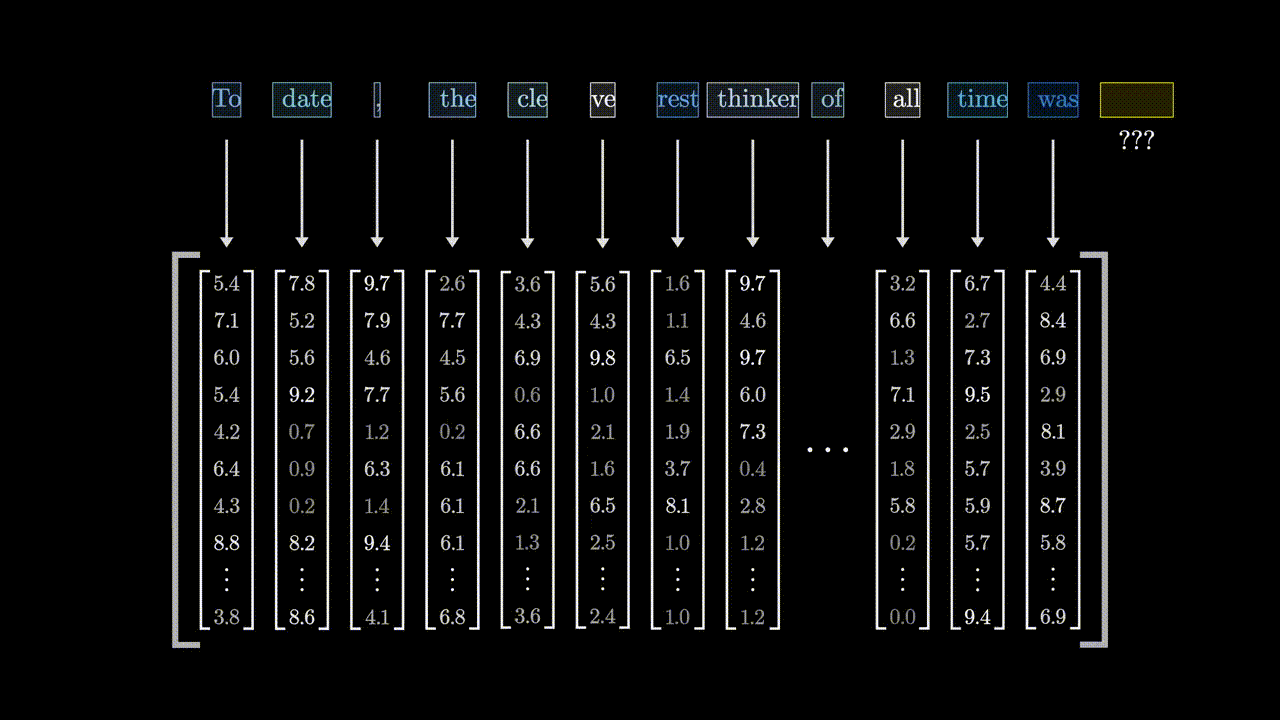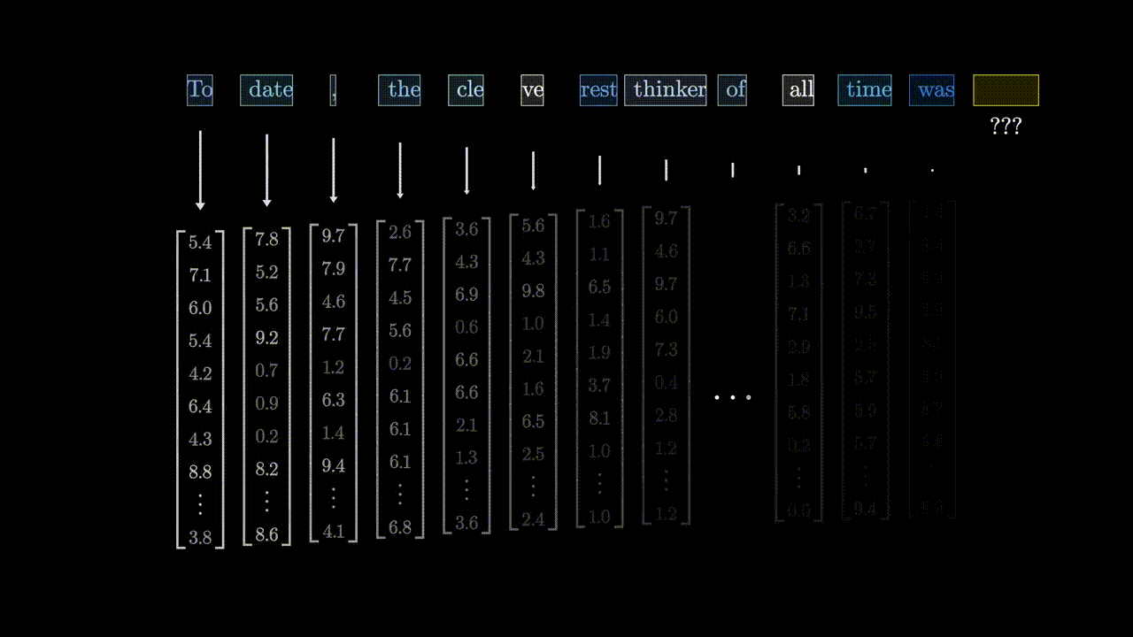 图:原始输入为 "To date, the cleverest thinker of all time was",让模型预测下一个 token。经过多层 attention + feed-forward 之后, 最后一层输出的最后一个向量已经学习到了输入句子表达的意思,(经过简单转换之后)就能作为下一个单词的概率