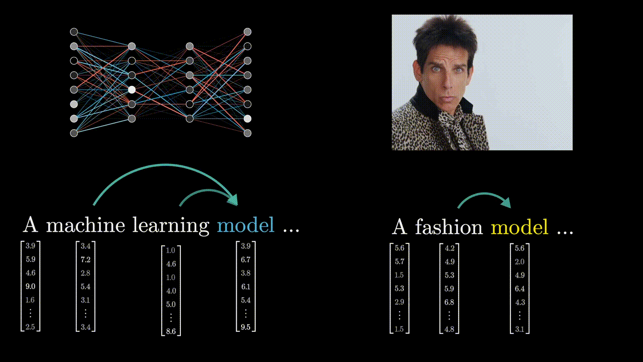 例如,“model” 这个词在 “machine learning model”(机器学习模型)和在 “fashion model”(时尚模特)中的意思就完全不一样, 因此虽然是同一个单词(token),但对应的 embedding 向量是不同的
