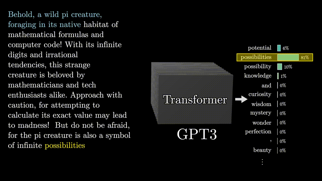 如果一切顺利,最后一层 feed-forward 输出中的最后一个向量(the very last vector in the sequence), 就已经包含了句子的核心意义(essential meaning of the passage)。对这个向量进行 unembedding 操作(也是一次性矩阵运算), 得到的就是下一个单词的备选列表及其概率: