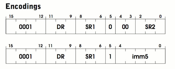 每个操作码代表 CPU “知道”的一种任务。在 LC-3 中只有 16 个操作码。计算机能够完成 的所有计算,都是这些简单指令组成的指令流。每条指令 16 比特长,其中最左边的 4 个 比特存储的是操作码,其余的比特存储的是参数。
